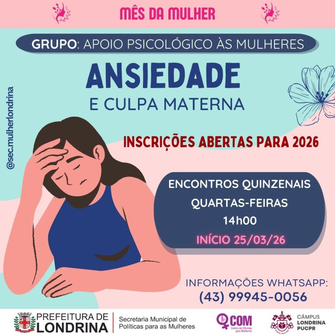Na quarta-feira, 25 de março, ocorre o primeiro encontro do ano do grupo de apoio psicológico para mulheres, com o tema 'Ansiedade e Culpa Materna'. A iniciativa, em parceria com o curso de Psicologia da PUC-PR Londrina, oferece um espaço acolhedor para troca de experiências e reflexões sobre os desafios da maternidade.