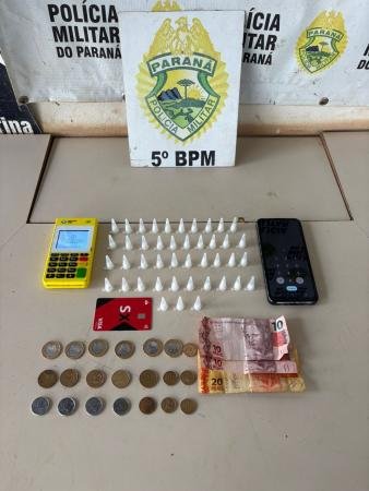 Na abordagem, foram encontrados com ela 43 pinos de substância semelhante à cocaína, R$ 49,40 em dinheiro trocado, uma máquina de cartão de crédito e um celular. A mulher confessou envolvimento com o tráfico.
